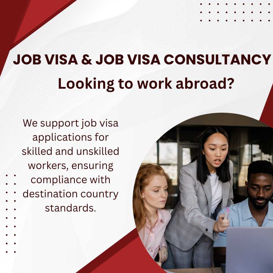 Looking to work abroad? We support job visa applications for skilled and unskilled workers, ensuring compliance with destination country standards.